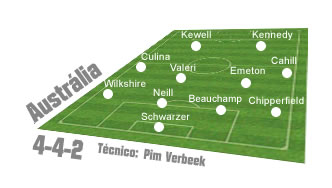 A Austrália irá para a terceira participação em Copa do Mundo — as outras foram em 1974 e 2006. A seleção disputou as Eliminatórias da Ásia e terminou na liderança do Grupo 1, à frente de Japão, Bahrein, Catar e Uzbequistão. A equipe do técnico Pim Verbeek tem entre os destaques os meias Tim Cahill e Harry Kewell.